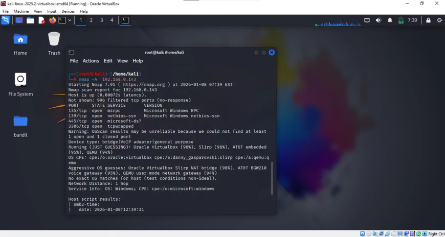 This is confirmed by OS fingerprints and service behavior. The scan also indicates that the target is likely running inside a virtualized environment rather than physical hardware.